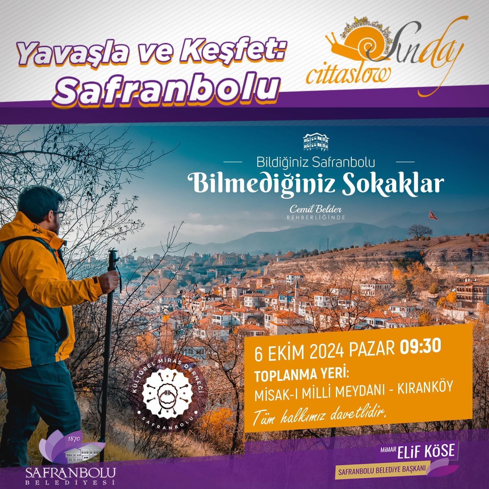 Safranbolu Belediye Başkanı Mimar Elif Köse öncülüğünde City (sakin şehir) unvanına sahip olan Safranbolu’nun benzersiz güzellikleri 6 Ekim Pazar günü yavaşla ve keşfet sloganı ile “Cittaslow Sunday” etkinliği gezilecek.